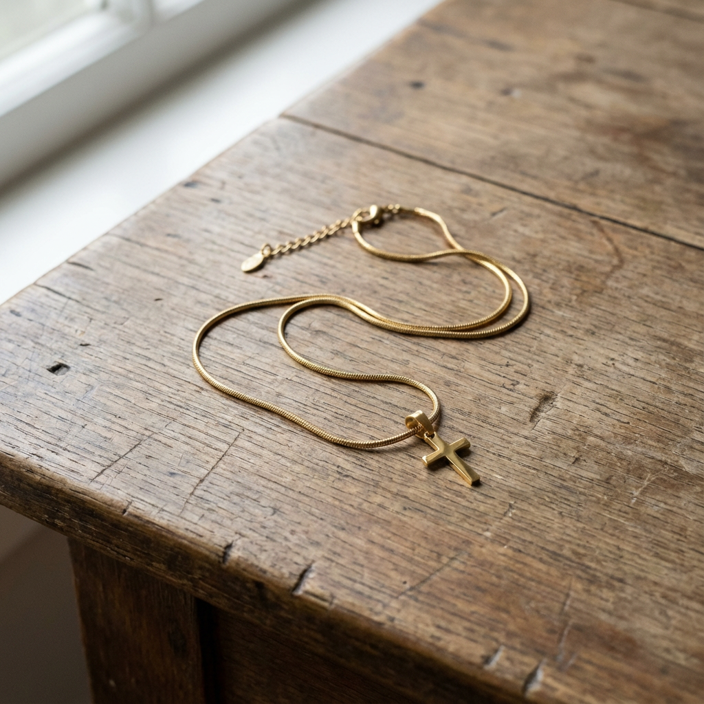 A simple cross necklace, assembled by hand in a routine and practical manner, as it has been for many years. It was not created as a product line, but as part of ongoing parish work.